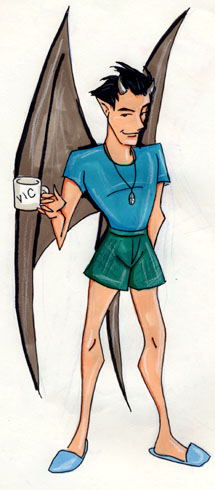 Jacob "Jake" XellosAge- 25 Height- 6' 11" Species- Demon/ Human Hybrid Type- Walking identity crisis. Background- Mail room clerk by day. Stand-up comedian by night. Strange freak of nature 24/7. Jake is so far the only known demon/human hybrid in exsistance, and considering humans and demons aren't..erm..compatable, that's quite a feat. When asked about Jake's orgins, Mrs Xellos tends to reply with "well...I was young and I really THOUGHT I orded a Pepsi that night!" The rest is a blur. Having a bit of an eye for Naomi, the hybrid falls all over himself to get her attention, turning into instant super dork. Naomi finds this quite charming. He often wonders how he get himself into dangerous situations. Jake tends to be the nice guy next door with a smile and a joke for anyone. That is, until you point out the fact that he has wings and horns, then he can get down right testy. He's very shy about his "disfunctions" and keeps them hidden whenever possible. His collection of hats is quite remarkable. Quote-" Doesn't that strike you as a little, oh, I dunno, nuts?" |
